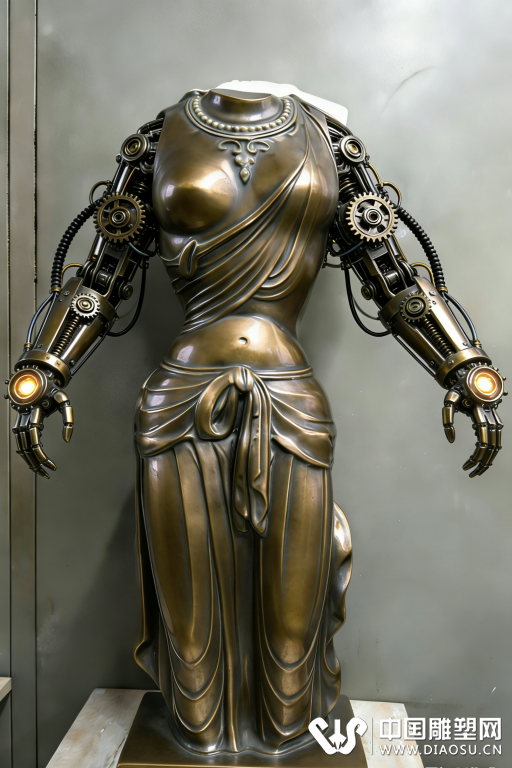 作品主体躯体采用陶瓷为创作材质,以敦煌造像的柔美体态为原型塑形,通过仿青铜釉色的工艺处理,还原出东方古典造像的温润肌理与流畅衣褶,陶瓷的细腻质感承载着中华千年陶艺的文脉底蕴,“梵”字所蕴含的东方禅意与古典造像美学,也在陶瓷躯体的形态中得到具象化表达。手臂部分则运用铁艺焊接工艺打造,齿轮、管线、精密关节等工业机械元素的组合,赋予作品冷峻的科技质感,铁艺的冷硬坚固与陶瓷的温润易碎形成强烈的材质反差与视觉张力。无头的造型设计消解了具象人物的身份标签,让作品从单一的造像转化为文化符号,隐喻着传统文化并非静态的遗产,而是能在现代科技的赋能下实现“破界重生”。整件作品通过陶瓷与铁艺的工艺结合、古典与工业的美学碰撞,探索了传统工艺美术在当代的创新表达路径,诠释了传统与现代共生共融的时代内涵。该作品获2025山东工艺美术博览会暨“山东手造”精品展上荣获“荷花杯”山东工艺美术设计创新大赛金奖。